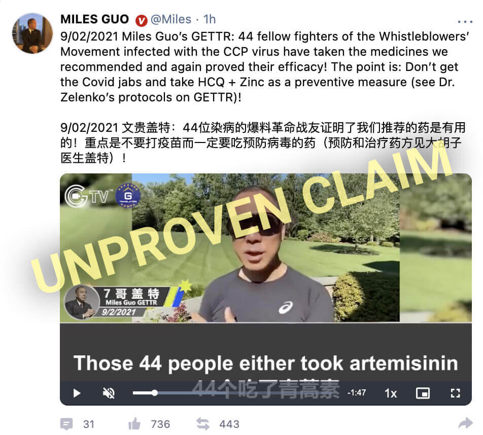 Guo’s network was an early promoter of the conspiracy theory that Covid-19 was a Chinese bioweapon and made a concerted effort to amplify unverified assertions by virologist Li-Meng Yan that the virus was created in a Chinese lab. For months, Guo’s network has seeded claims in videos, media, and social media posts that the CCP has always had an antidote to the virus they intentionally created. Now, Guo has “unveiled” artemisinin, which he says is one of five secret cures for Covid-19.