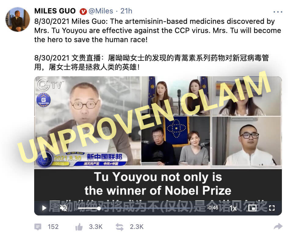 In social media posts amplifying the artemisinin narrative, Guo continuously credits Nobel Prize winning scientist Tu Youyou who he calls the “hero to save the human race.” Similar to Guo’s early promotion of Li-Meng Yan and other conspiratorial doctors and scientists, the involvement of experts such as Tu Youyou appears to legitimize the supposed cure. However, while Tu Youyou did receive the Nobel Prize for her work using artemisinin to cure Malaria, she has not published research suggesting the drug can be used to treat Covid-19. In his livestream, Guo claims he has already informed governments around the world of this finding, and that some of the information which led to the revelation came directly from sources within the CCP.