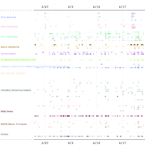 Although the Filipino government has used red-tagging for decades, its use resurged under Duterte through official red-tagging pronouncements and social media posts, according to Human Rights Watch. Graphika’s analysis shows red-tagging to be prevalent across several platforms, and that it is often deployed haphazardly against politicians critical of Marcos and Duterte, members of the media, and civil society organizations. Of particular concern is the use of multiple government institutions to formalize red-tagging and subsequent physical attacks against its victims. For example, Graphika found evidence that social media accounts affiliated with the police had attempted to red-tag left-wing political organizations.