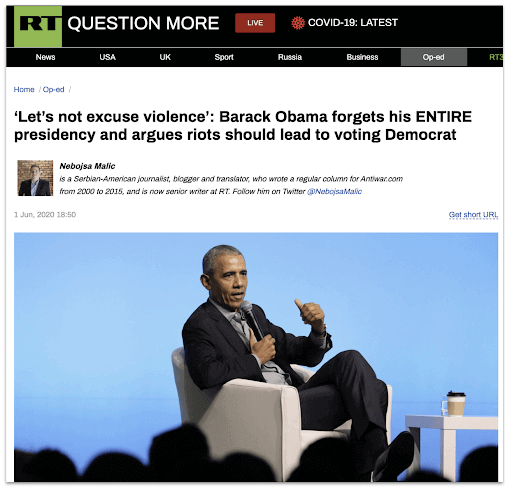 Editorial on RT accusing Obama of “urging people not to excuse or rationalize the violence. He then proceeds to do just that.” In fact, far from excusing or justifying violence, the former president’s article on which this RT attack was based explicitly condemned the violence: “putting innocent people at risk, compounding the destruction of neighborhoods that are often already short on services and investment and detracting from the larger cause.”