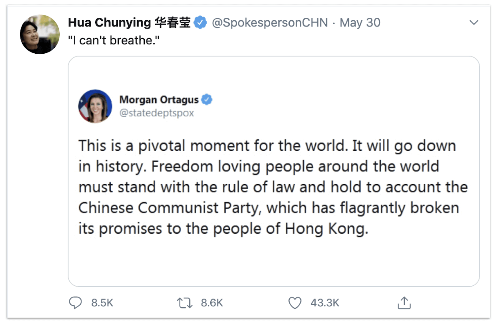 Tweet by Chinese Foreign Ministry Spokeswoman Hua Chunying, quoting Floyd’s last words to her American counterpart. The Chinese official’s tweet included a screenshot of a tweet by Ortagus on May 30, referencing the Hong Kong law.