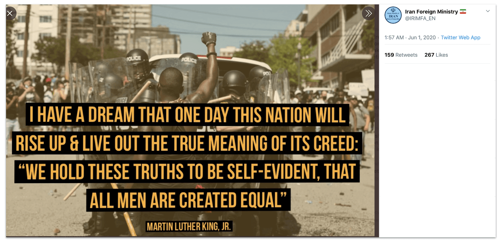In a similar vein of reflecting American words back at the White House, the Iranian Foreign Ministry posted a photo of the protests alongside a quote from Martin Luther King’s immortal “I have a dream” speech.