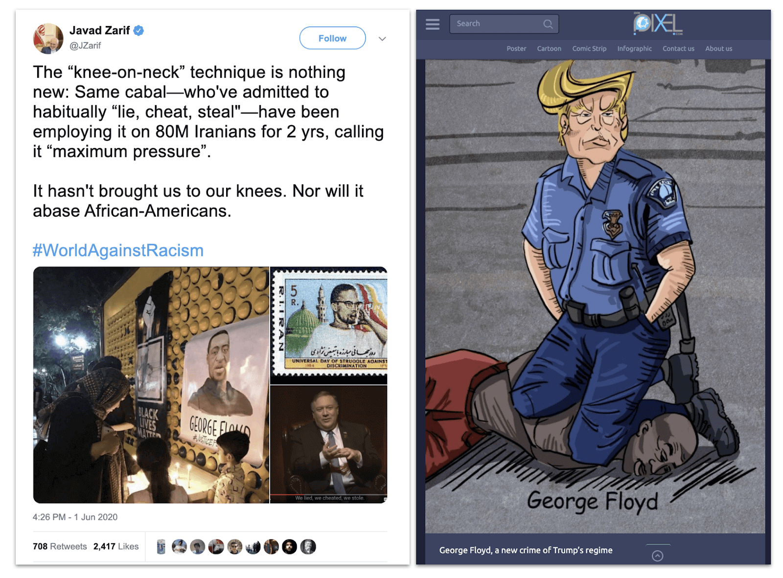 The manner of Floyd’s death - asphyxiated by a policeman kneeling on his neck - provided particular fuel for Iranian outlets both overt and covert. In another tweet, Zarif connected the death with the U.S. policy of “maximum pressure” sanctions on Iran, while the pro-regime website IUVMpixel.com used it to personify Trump as the perpetrator with a cartoon headlined, “George Floyd, a new victim of Trump’s regime.”