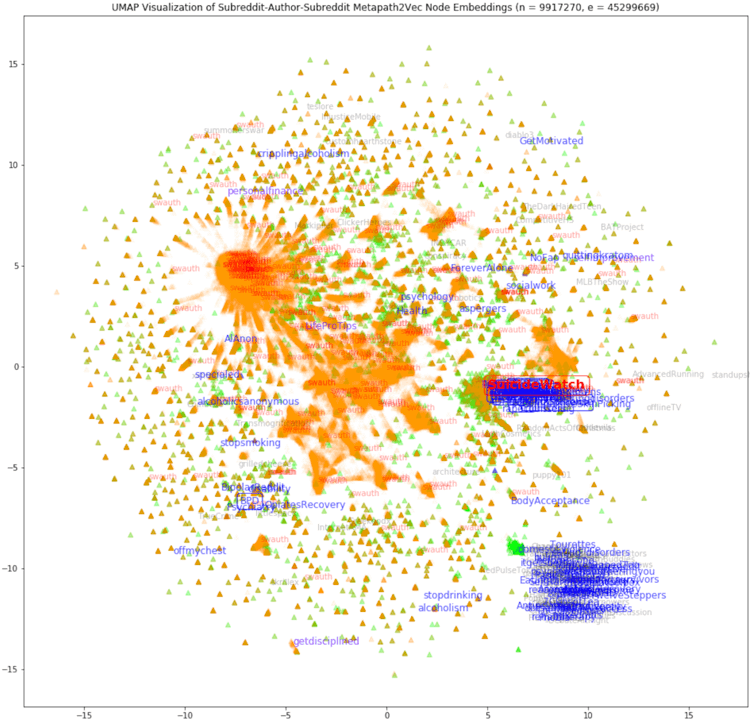 By integrating deep learning models for network and language data, we were able to determine the behavioral and language similarities between nearly 10 million author, submission, and subreddit nodes on Reddit and visualize major clusters in the network. We also predicted who interacted in a mental health community for suicide support using data from our similarity models with 90% accuracy and only 10% false-positives and false-negatives.