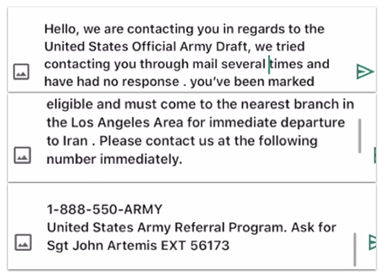 In January 2020, after the United States killed Iranian General Qasem Soleimani, a spate of text messages warned Americans that they had been drafted for the expected World War Three. On that occasion, the Army Recruitment Office published a rebuttal, triggering speculation that the messages had been sent by an Iranian influence operation.