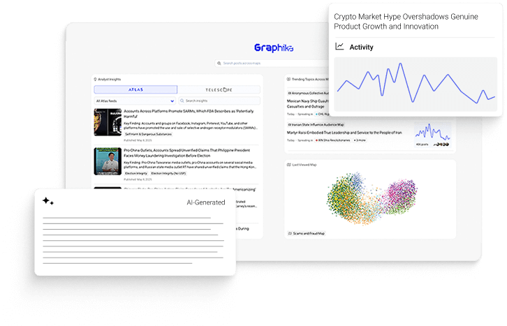 From detecting coordinated influence operations and countering brand attacks to identifying critical indicators of compromise, Graphika helps you see what others miss. Our OSINT surfaces emerging threats, maps critical narratives, and delivers early warning—enabling fast, informed, and decisive response.