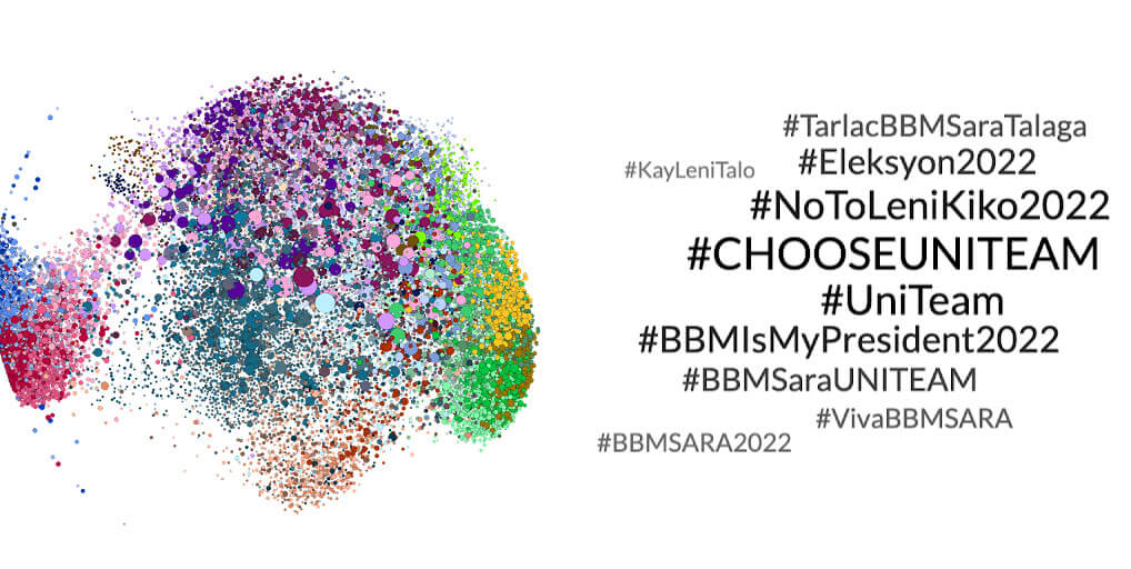 Red-tagging is just one way social media has been used to incite offline violence in the Philippines. Marcos and his supporters have now adopted this tactic as well as other forms of harassment to target political rivals and the media. Then, in late March, Duterte’s faction of the ruling PDP-Laban party endorsed Marcos for president. Since then, Graphika’s network maps have shown an increased convergence between the Marcos and Duterte online communities of supporters. This consolidation can be seen in Graphika’s Philippines 2022 Election Landscape map, where the top hashtags within the pro-Duterte group all support Marcos.