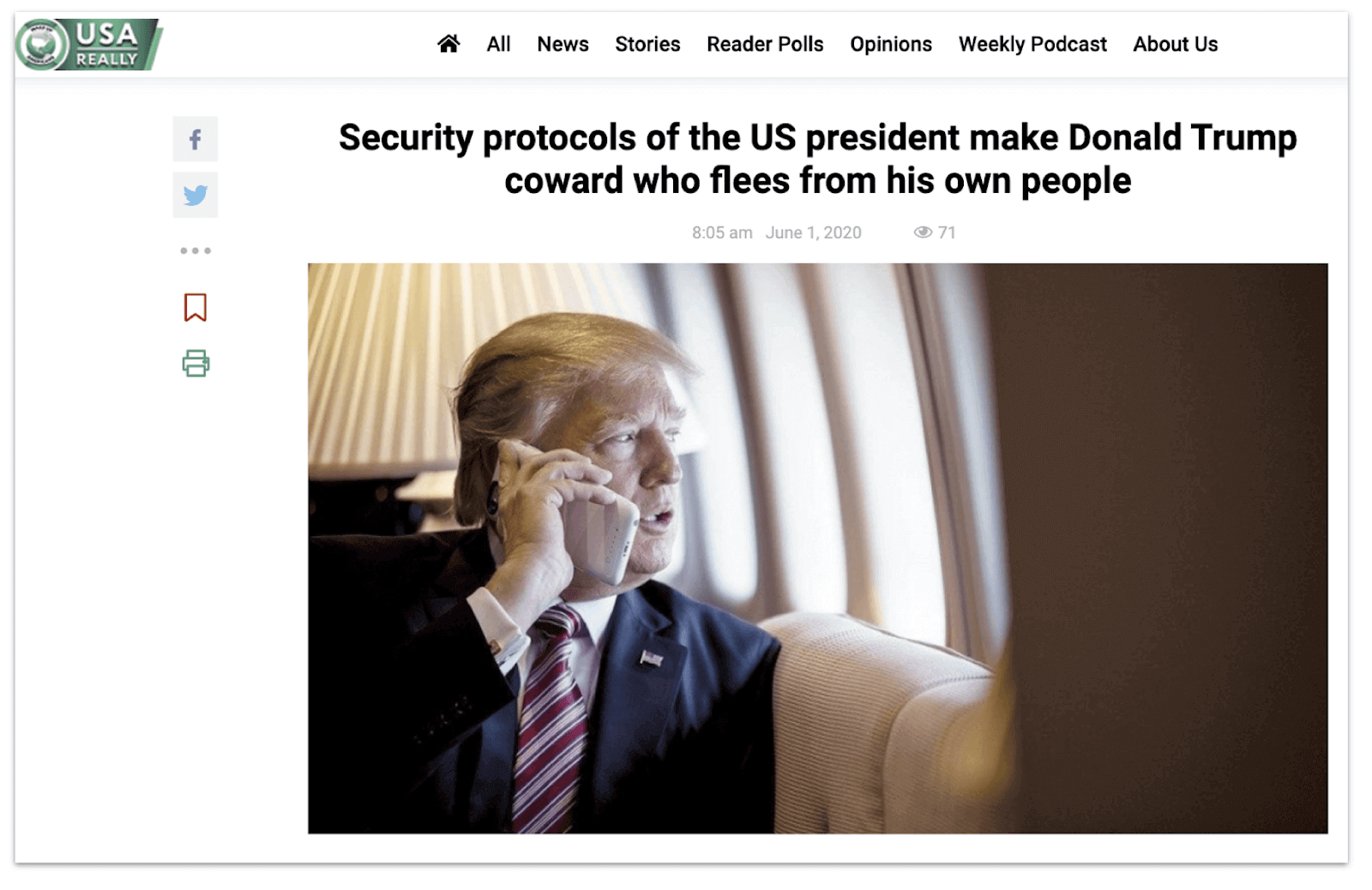 Article by USA Really calling Trump a coward for taking shelter in the White House bunker during protests against the killing. USA Really is funded by the Federal News Agency (RIAFAN), which was exposed in 2015 as being connected to the Internet Research Agency.
