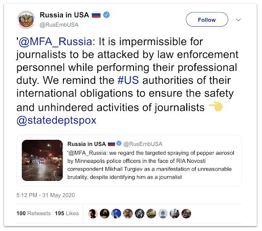 Tweet by the Russian embassy to the United States on the treatment of a Russian journalist.
