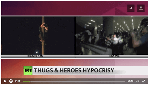 Screenshot of the RT newscast “Thugs and heroes hypocrisy,” contrasting Minneapolis and Hong Kong.