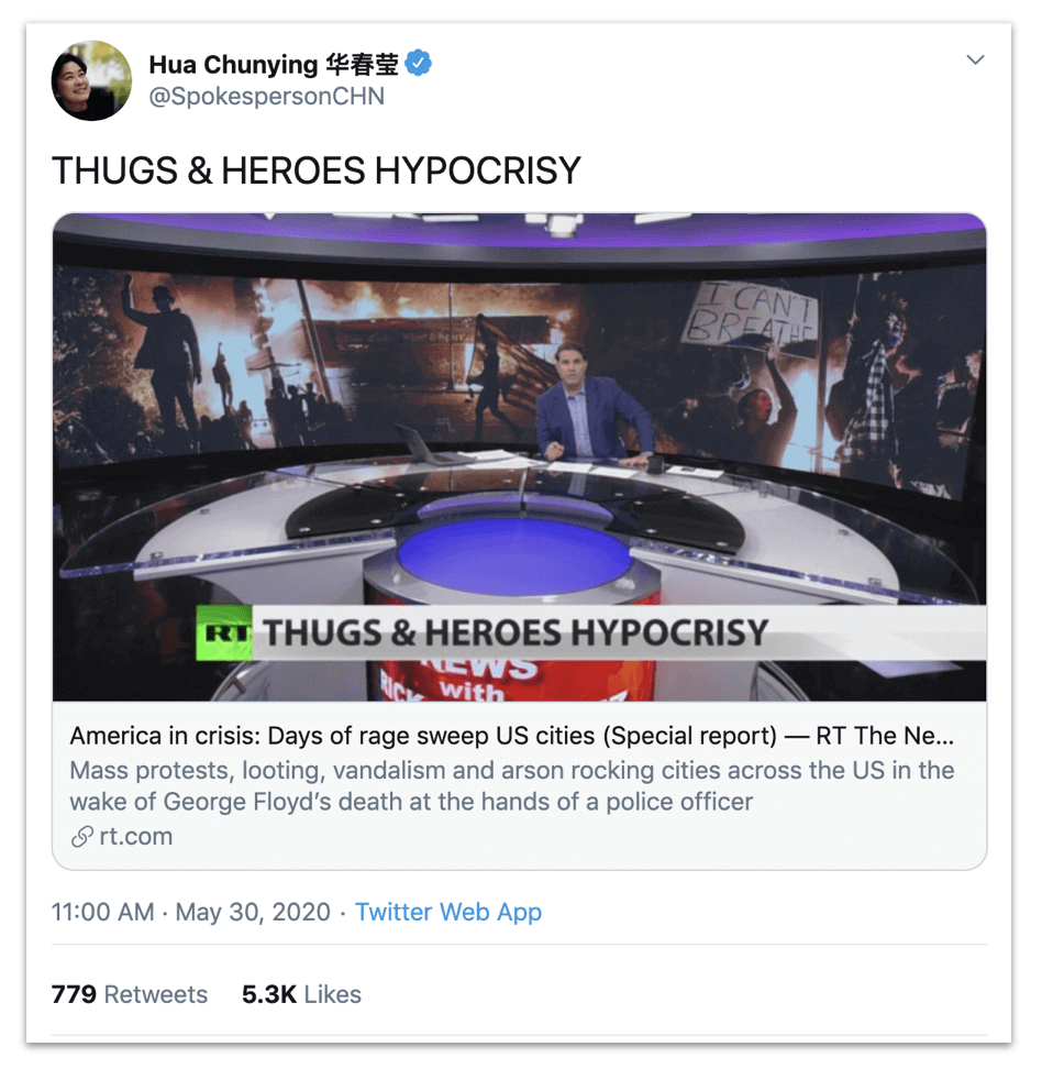 None of these articles mentioned the protests that had begun to sweep across the United States. As the protests took hold, Chinese officials and state outlets portrayed them as proof of the hypocrisy claim and posted or amplified messages that explicitly contrasted the situation in the United States with the earlier protests in Hong Kong. This was opportunistic messaging to bolster an existing narrative, not an attempt to create a new one.