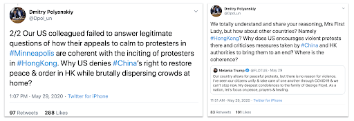 Tweets by Russia’s deputy permanent representative to the United Nations comparing the Hong Kong and Minnesota protests, including by replying to First Lady Melania Trump.