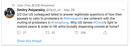 Some Russian state content did pick up on the claim of U.S. “hypocrisy,” and even put it in the context of the Hong Kong law. An RT show on May 29 made the contrast explicit under the headline, “Thugs and heroes hypocrisy.” The same day, Russia’s Deputy Permanent Representative to the United Nations accused the United States of denying China’s “right to restore peace & order in HK while brutally dispersing crowds at home.” This shows a strong narrative convergence between Russian and Chinese messaging, discussed below.