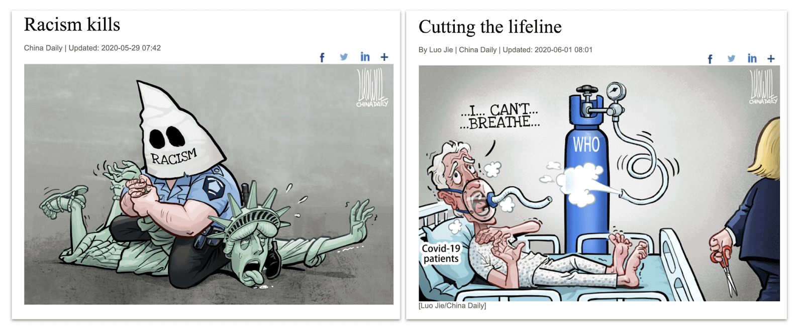 Cartoons by the China Daily May 29, onracism, and on June 1, portraying Trump cutting the WHO’s lifeline.