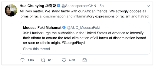 Post by Hua Chunying quoting the President of the African Union Commission, who condemned “continuing discriminatory practices against Black citizens of the USA.”