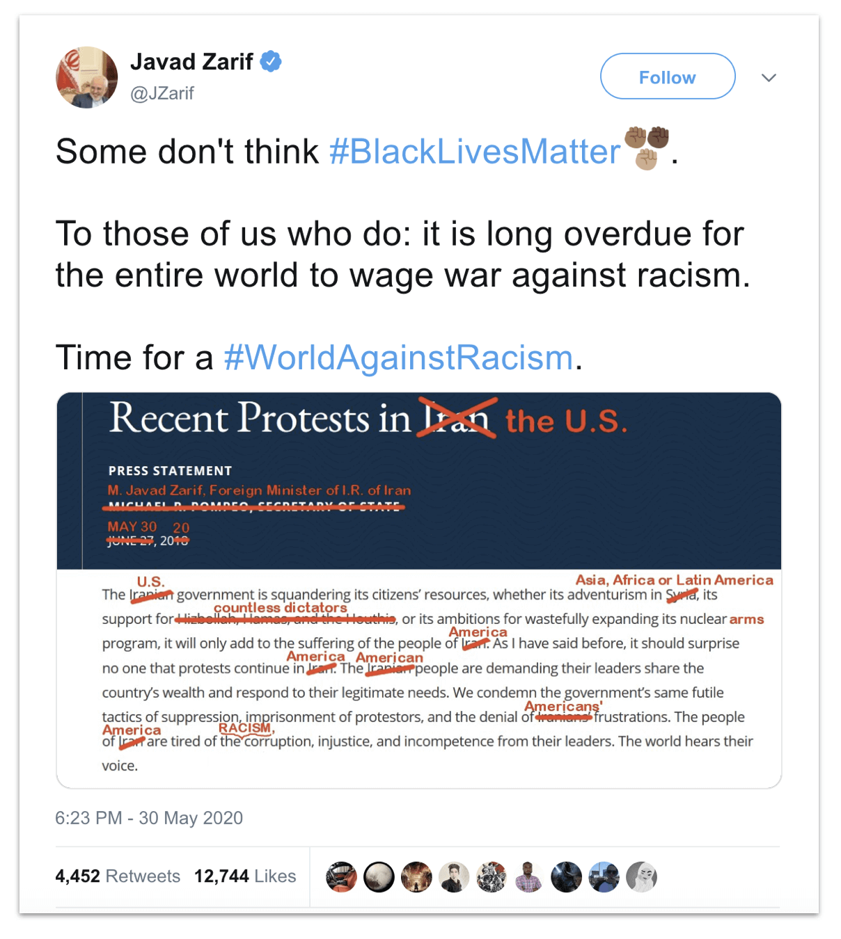 Iran’s response to the U.S. protests was similar to China’s in its broad outline: it took U.S. criticisms of Iranian crackdowns on demonstrations and turned them on the United States. Once more, the tone was troll-like: Iran’s Deputy Foreign Minister Javad Zarif even took a screenshot of a genuine U.S. statement about protests in Iran and edited/annotated it to criticize the United States.