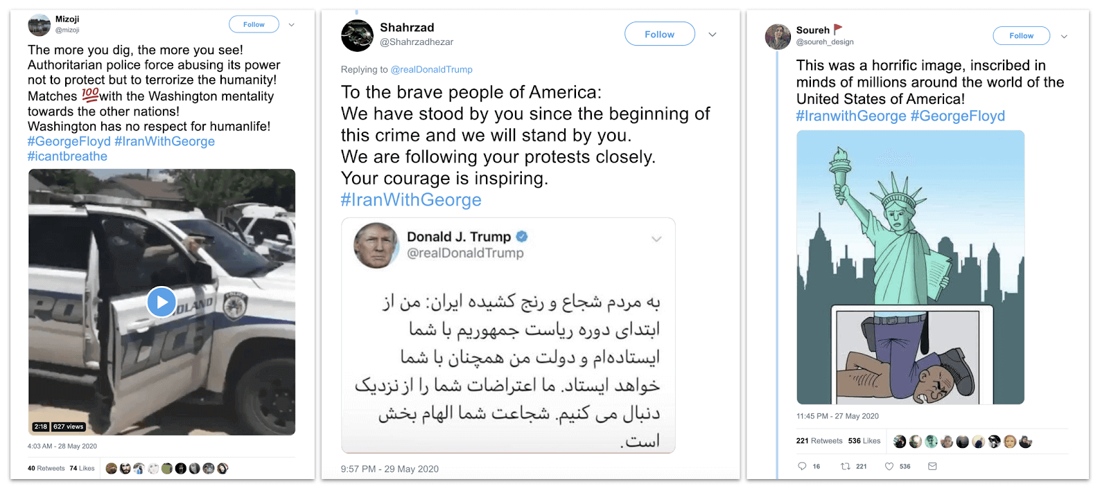 Threetweetsby pro-Iranian accounts on the #IranWithGeorge hashtag. The central post mocks aTrump post in Persian that supported protesters in Iran, in another case of reversing American messaging to attack the United States. The right-hand post reproduces acartoon by an artist in Morocco.