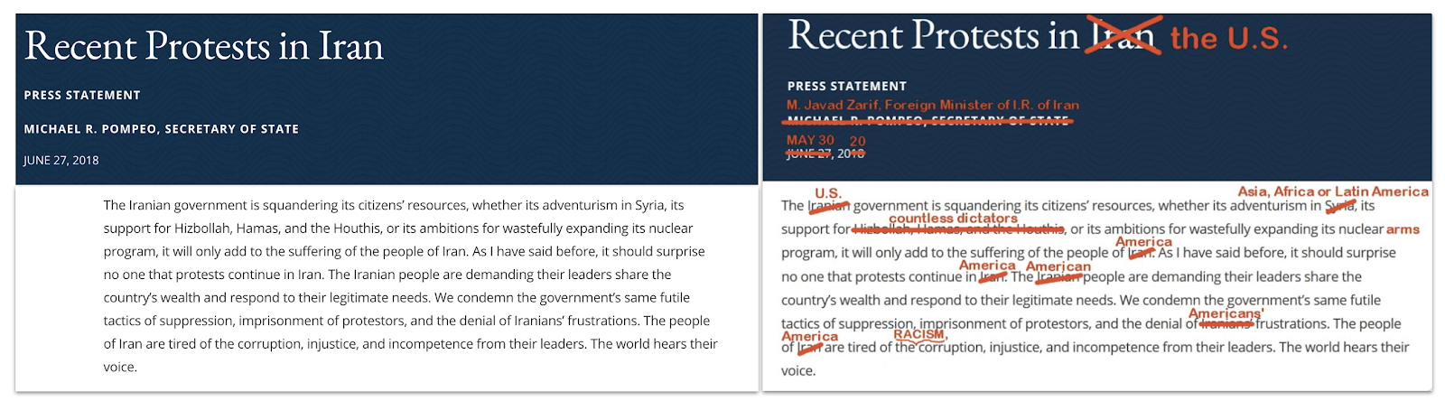Left, the statement by Secretary Pompeo. Right, Deputy Minister Zarif’s edition.