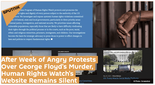 Attack on Human Rights Watch by Sputnik, accusing the NGO of “deafening silence” and “seemingly turning a blind eye to the humanitarian crisis unfolding on Stateside streets,” on the grounds that the organization’s website did not mention George Floyd’s name. In fact, the website on June 1 referenced the riots as the top story on its daily briefing and called for “meaningful reforms of policing” in America, but did not mention the victim by name. HRW staff tweeted widely about police brutality and the protests, as the HRW Twitter feed makes clear.
