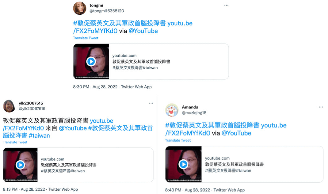 Accounts associated with this campaign used identical or near-identical language in their posts, which usually consisted of a video title and the hashtag “urging Tsai Ing-wen and her civil and military leaders to surrender” in either traditional or simplified Chinese. Some posts included more generic hashtags, such as #taiwan and #蔡英文 [Tsai Ing-wen], possibly an attempt to reach wider audiences.