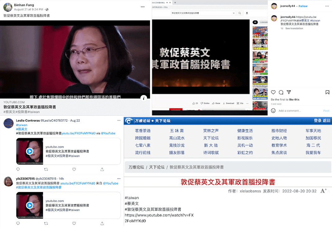 The actors behind this activity then promoted the videos across multiple online platforms using accounts that showed clear signs of inauthentic behavior. In most cases, likely inauthentic accounts uploaded the videos to YouTube and other assets then shared links to the content across platforms including Instagram, Facebook, Twitter, and Reddit. The campaign also targeted alternative platforms such as Gettr and Chinese-language discussion forums. Posts typically used identical or near-identical language, often consisting of the video title alongside the hashtags #敦促蔡英文及其軍政首腦投降書 [urging Tsai Ing-wen and her civil and military leaders to surrender] or its simplified Chinese equivalent #敦促蔡英文及其军政首脑投降书, #蔡英文 [#TsaiIngwen], and #taiwan. We also identified posts in Korean, Japanese, and French languages sharing links to the videos.