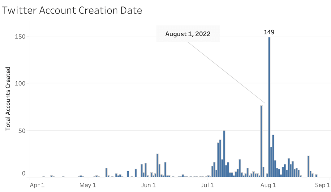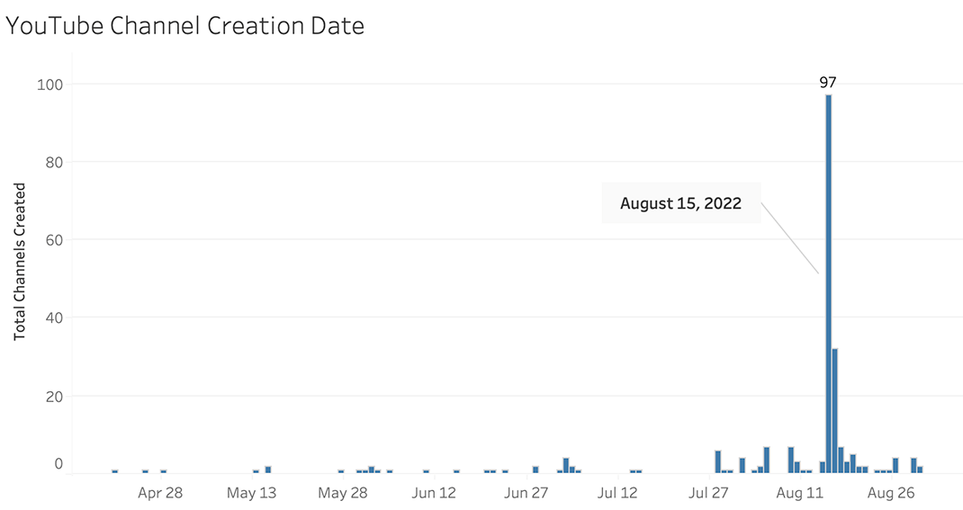 Graphika identified repeated evidence of batch account creations, a common indicator of coordinated activity. Of the 1,077 likely inauthentic Twitter accounts mentioned above, 1,023 were created between June - August this year, with 149 registered on the same day: Aug. 1. On YouTube, we identified 310 channels that had posted hashtags or key terms used in the campaign. Most of these were created between July and August, with 97 created on Aug. 15 alone.